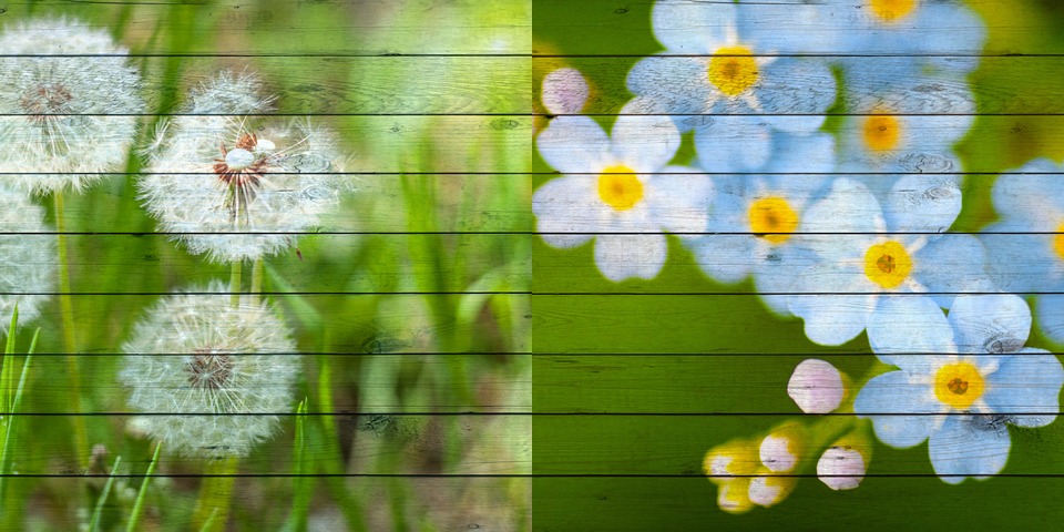 Photograph of Dandelions on a Field Along with a Branch with Blue Flowers Over Wooden