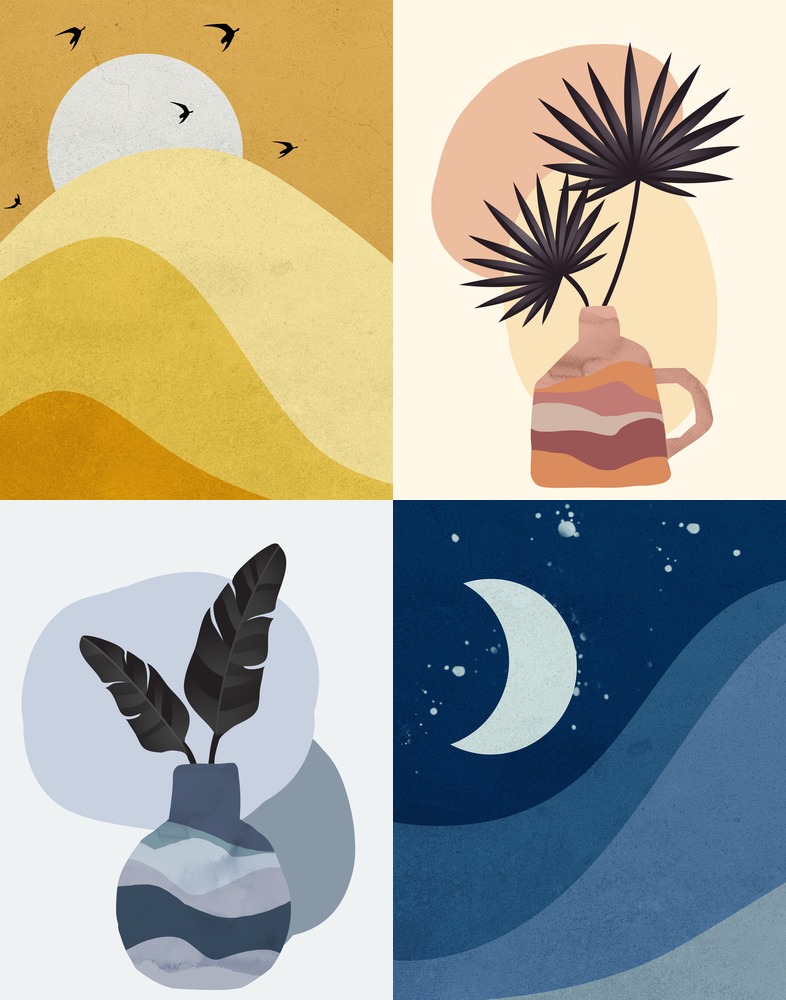 Framed Collage Set Birds in Desert Palm Leaves Moon Abstract Nature Illustrations Decorative Multicolor Living Room Office Bedroom Black Frame
