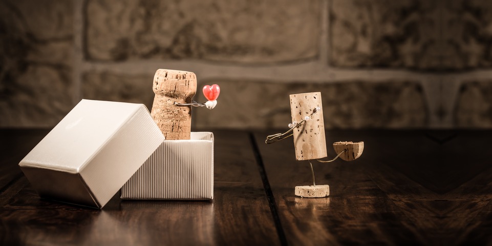 Concept Love Present with Wine Cork Figures Stretched and Framed
