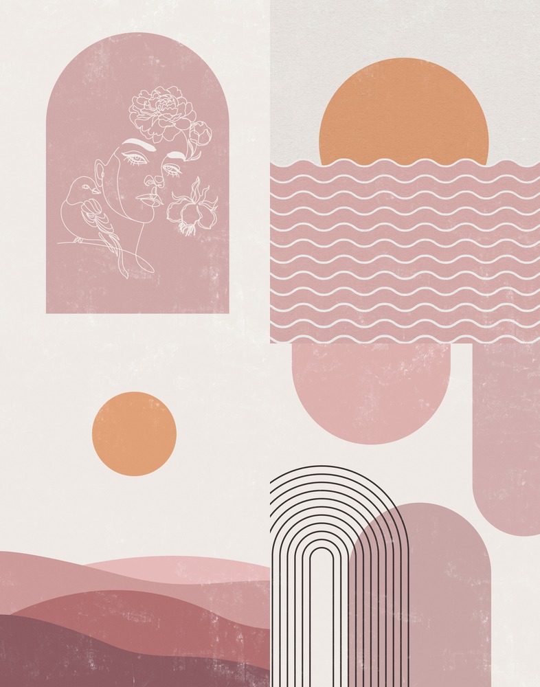 SIGNLEADER Framed Set Decor Grunge Pink Polygon Sun Landscapes Abstract Shapes Illustrations Rustic Colorful Living Room Bedroom Office White