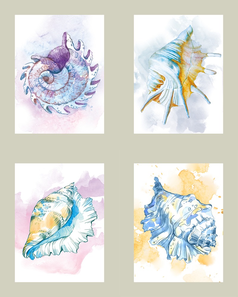 Ashbrook Framed Collage Set Watercolor Seashell Variety Amphibians Ocean Illustrations Beach Nautical Pastel Living Room Bedroom Office White