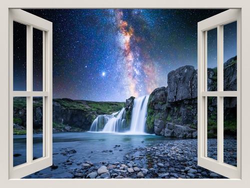 Removable Sticker Mural Fantasy SciFi Milky Way Galaxy Waterfall Astronomy Space Nature Digital Realism Rustic Landscape Colorful Living Room Bedroom Office