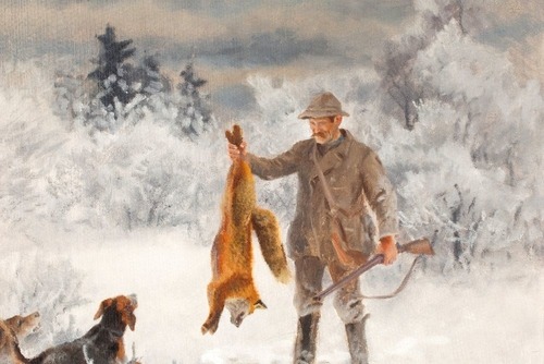 Hunter with Hunting Dogs and Fox by Bruno Liljes