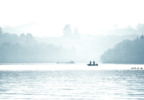 Large Mural Calm Water Surface in The Mist with Men Fishing in a Boat SelfAdhesive Vinyl paperRemovable