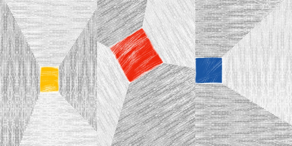 Blue and Red Perspective Squares Geometric Line Illustrations MidCentury Warm Living Room Bedroom Office White