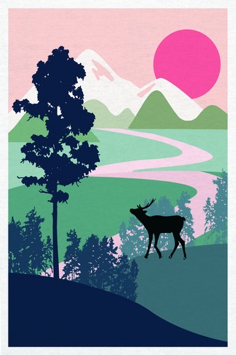 Framed Elk Overlooks Green Mountains Animals Wilderness Illustrations Rustic Landscape RelaxCalm Warm Living Room Bedroom Office Natural