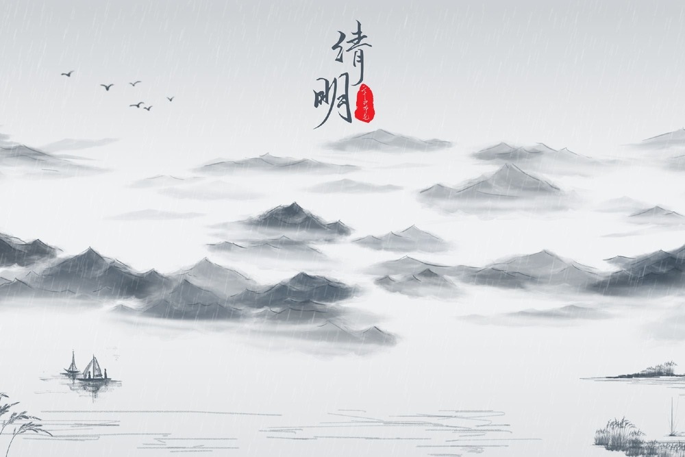 Chinse Ink Painting of Landsape with Mountains and Rivers in Qingming Festivel