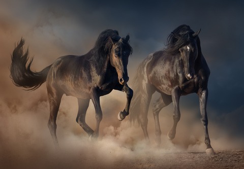 Two Black Stallion Run in Desert Dust Against Sunset Sky Removable Mural SelfAdhesive Large paper