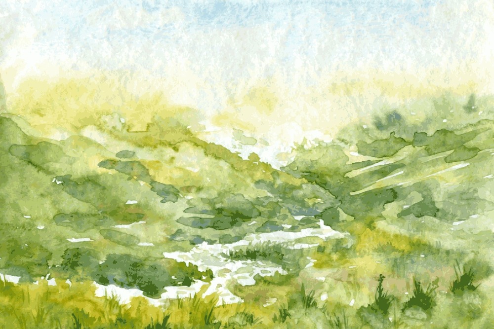 Watercolor Mountain Valley Green Grass in Spring