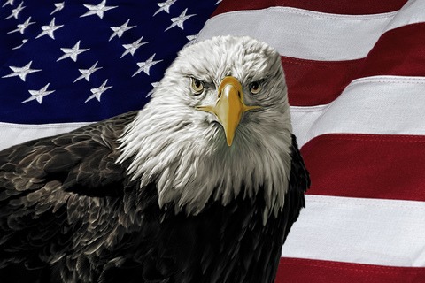 Majestic Bald Eagle Against a Photo of an American Flag Patriotic ation