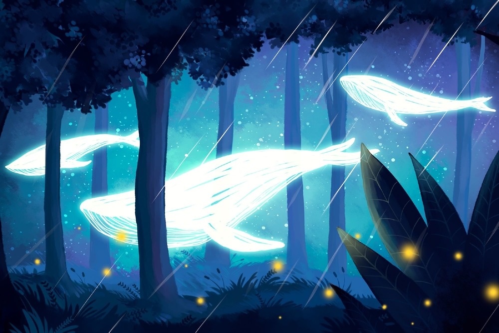 Hand Drawing Mystical Whale of Light Swimming in The est at Night