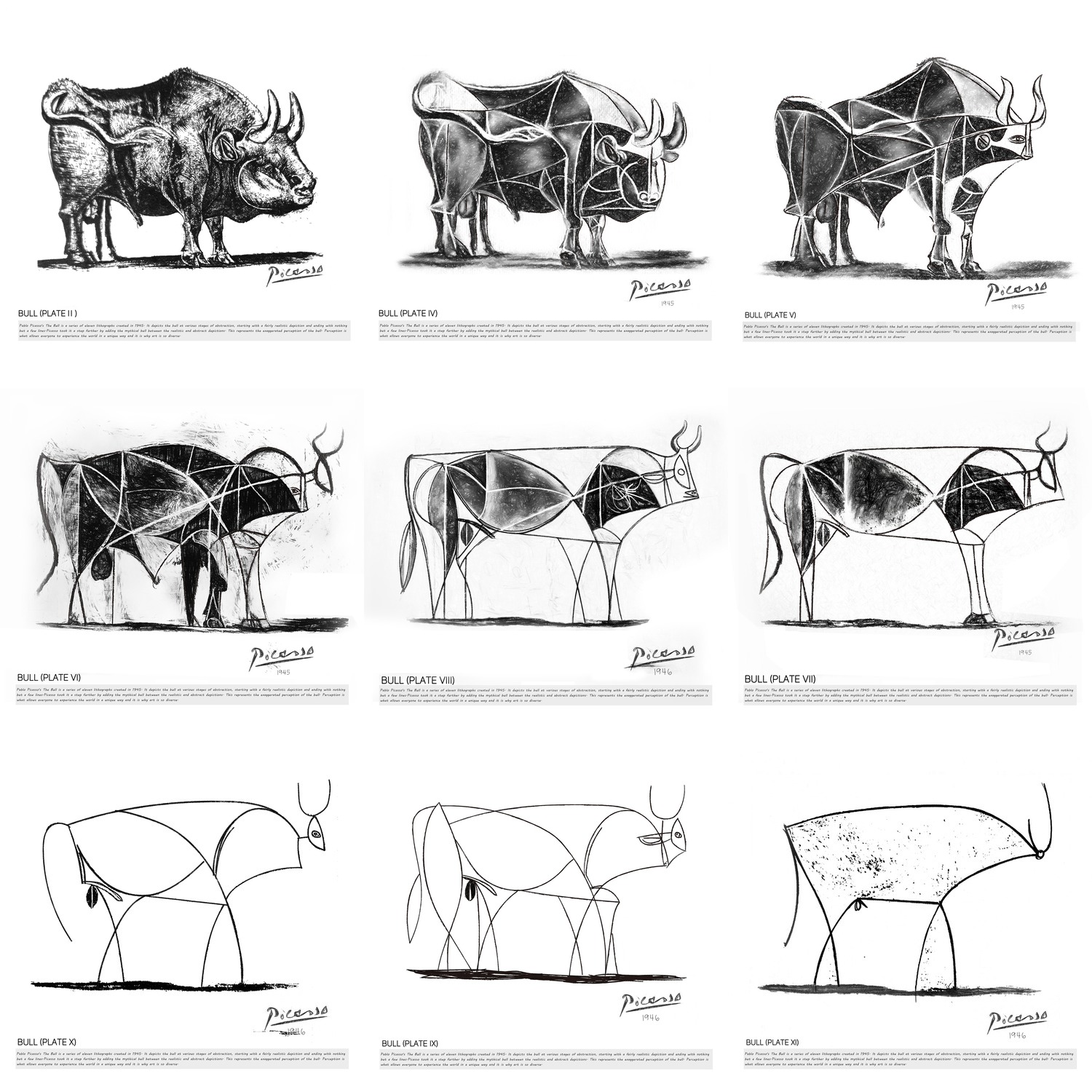 Framed Collage Set Pablo Picasso Geometric Bull Drawings Nature Animals Illustrations Fine Rustic Scenic Black White Living Room Bedroom Office BLACK