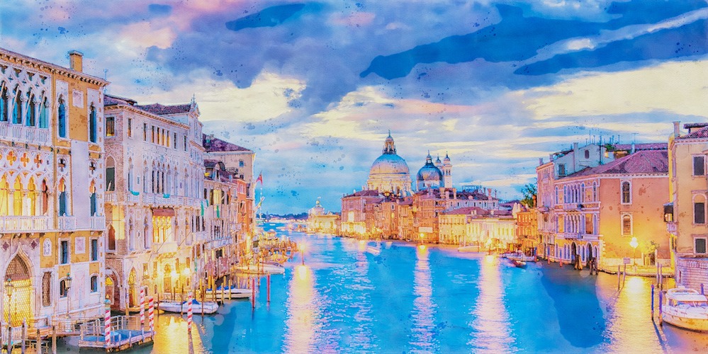 Framed Set Pastel Watercolor Venice Canal at Sunset Architecture Maps Cities Illustrations Colorful Living Room Bedroom Office Natural