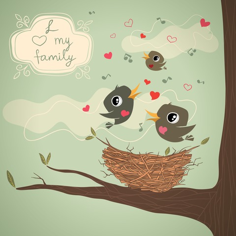 Family of Cartoon Birds Over The Nest with Musical Notes Hearts Ideal Children Kids Room Bedroom