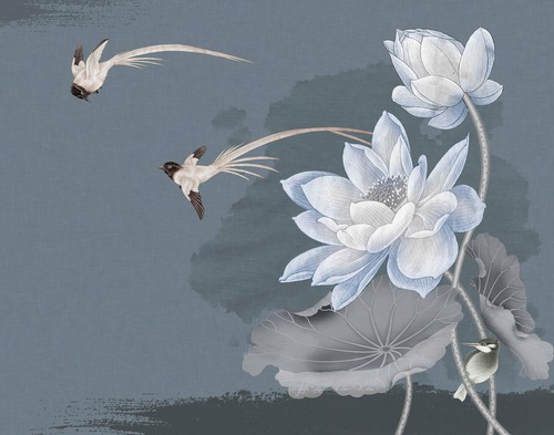 Framed Poster White Lotus Flowers and Birds in AsianInspired Blue Background Illustrations Realism Rustic Nature RelaxCalm Multicolor Living Room Bedroom Office Natural
