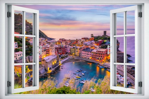 Window View Charming Vernazza Italy Seaside Sunset Scene Photography Realism Rustic Scenic Colorful RelaxCalm Ultra Living Room Bedroom Office