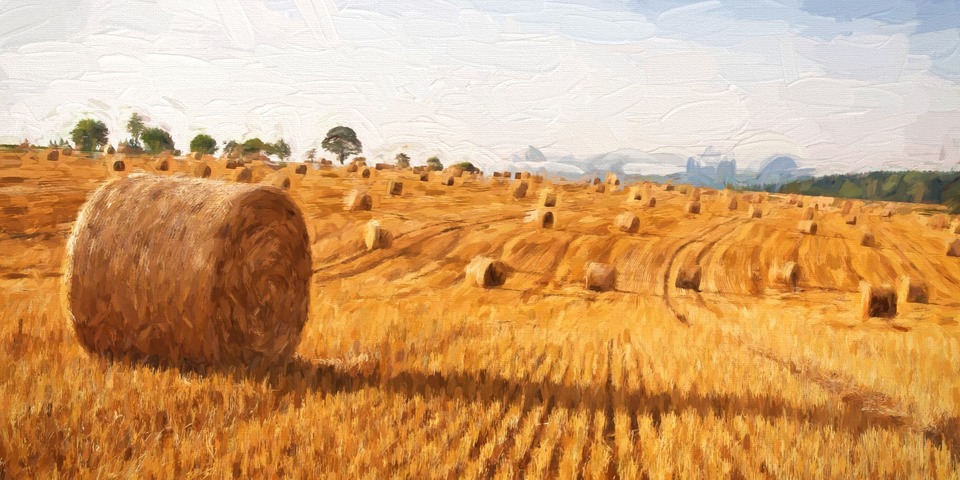 Oil Painting Summer Landscape Hay Bales on The Field After Harvest Stretched and Framed