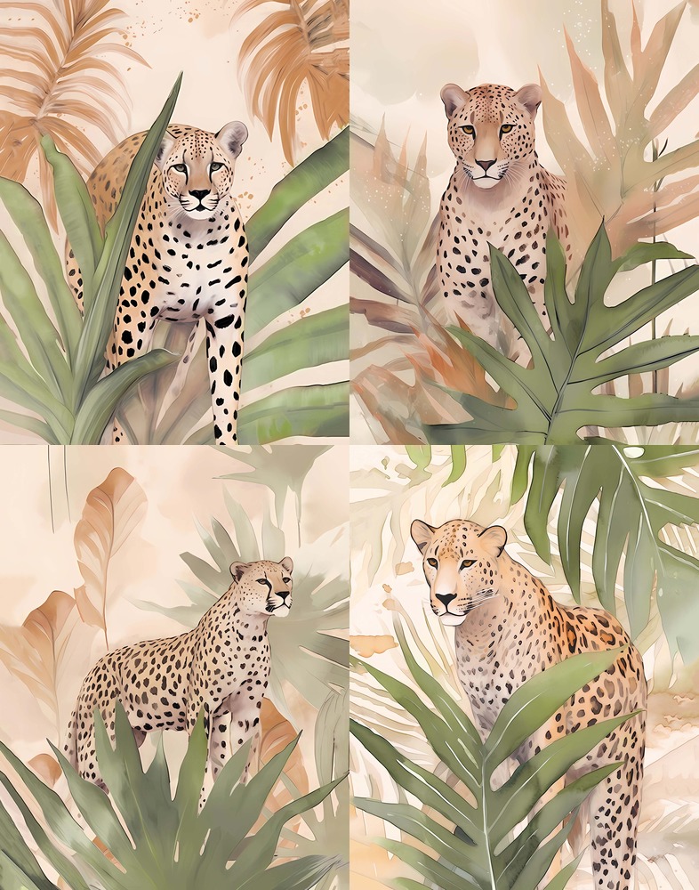 Framed Tropical Island Rainest Monstera Leaf Palm Tree Set of Cheetah Cat Animal Safari Nature Wilderness Décor Living Room Bedroom WHITE