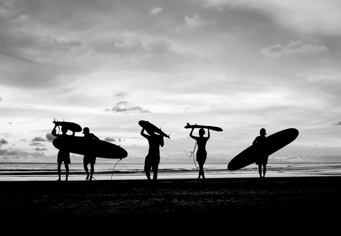 Silhouette of Surfer People Carrying Their Surfboard on Sunset Beach Black and White Color Removable Mural SelfAdhesive Large paper