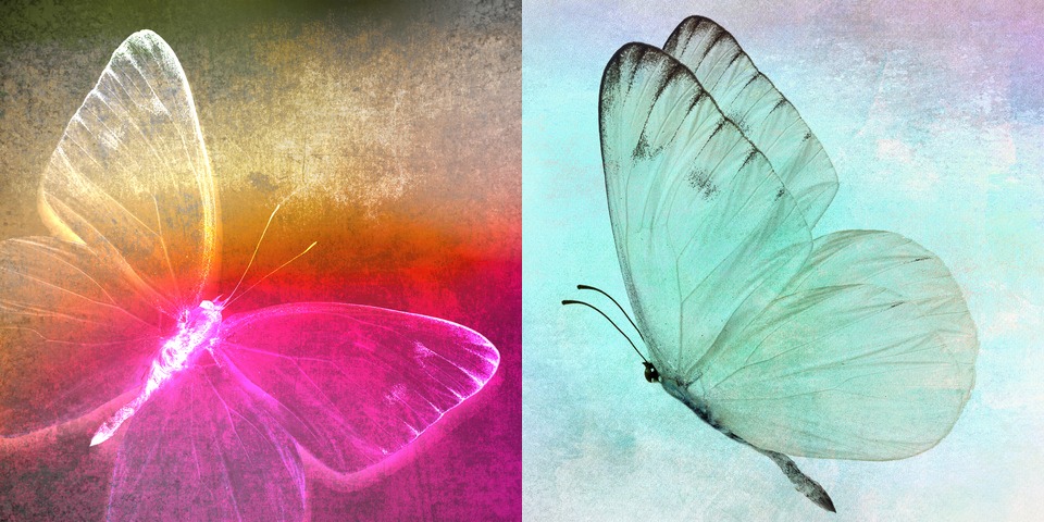 Image of an Electrically Colored Butterfly and a Calming Butterfly Caught in Mid Flight