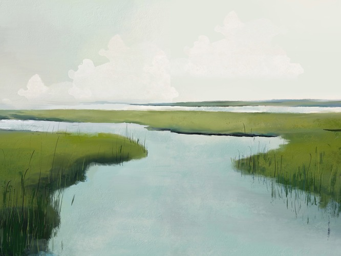 Ashbrook Framed Coastal Marshland Landscape Tranquil Green Wetland Painting with Water Reflections Illustrations Calm Living Room Bedroom Office WHITE