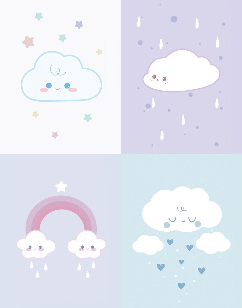 Framed Collage Set Kids Comic Pastel Clouds Rainbows Cartoon Nature Illustrations RelaxCalm Multicolor Living Room Office Bedroom White Frame