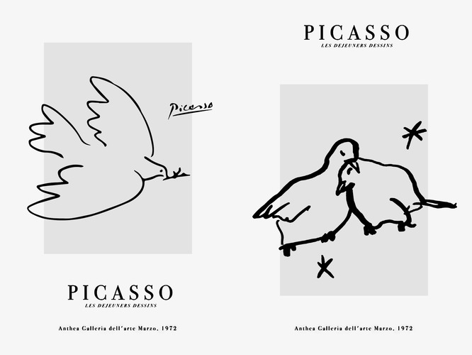 Framed Set Drawing of Peaceful Doves on Gray Background Abstract Shapes Illustrations Fine Contemporary Expressive Living Room Bedroom Office
