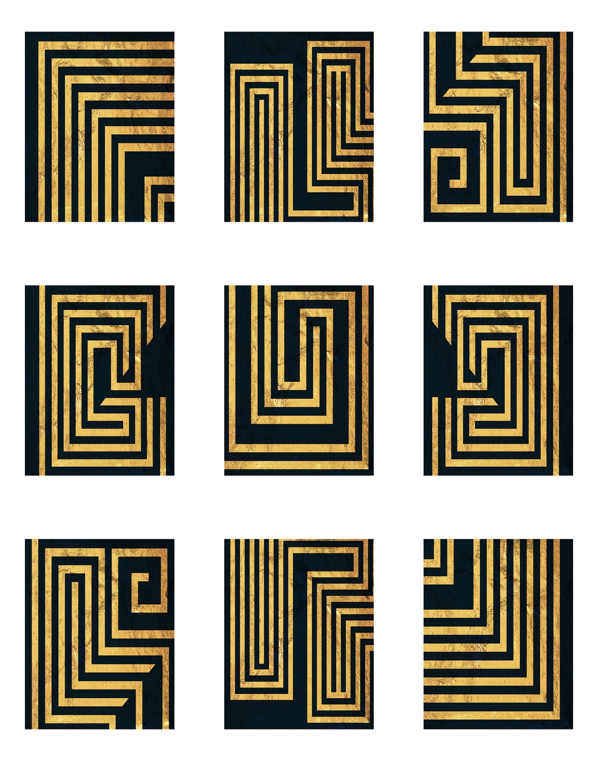 Framed Collage Set Gold Geometric Puzzle Maze Line Abstract Shapes Digital Contemporary Dramatic Fun Bedroom Living Room Office Black