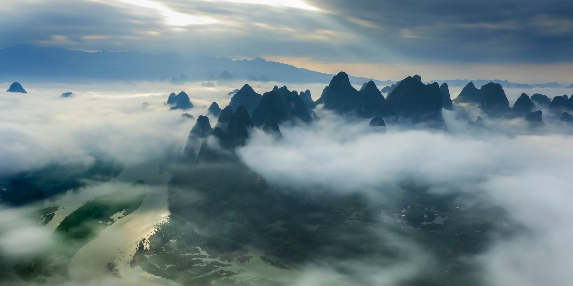 Panel Bird View Landscape of MountainsRivers and Village from Above The Clouds