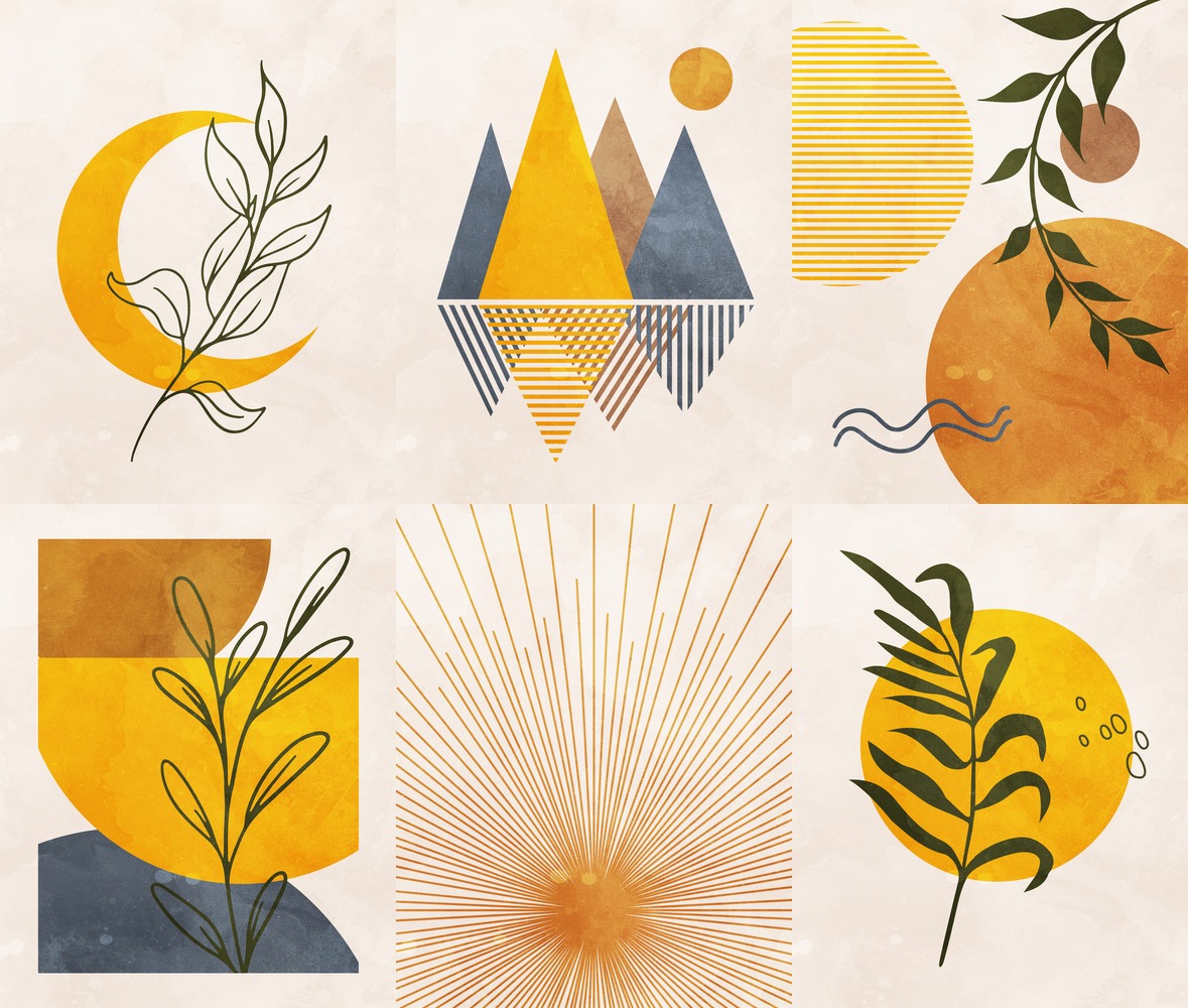 Framed Set Decor Crescent Moon Plants Polygon Mountains Abstract Shapes Illustrations Decorative Nordic Living Room Bedroom Office Natural