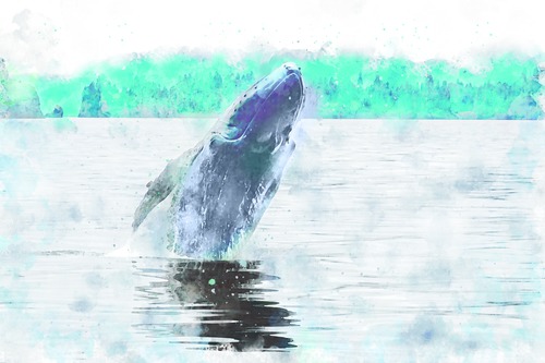 Watercolor Humback Whale Emerging Surface of Calm Blue Ocean Animals Sealife Illustrations Elements Fun Living Room Bedroom Office