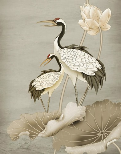 Framed Poster Majestic Cranes Among Lotus Flowers in Traditional Asian Illustrations Realism Rustic Nature RelaxCalm Multicolor Living Room Bedroom Office Black