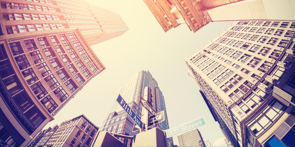 Vintage Filtered Fisheye Picture of Manhattan Looking Up at Sky New York City USA Stretched and Framed