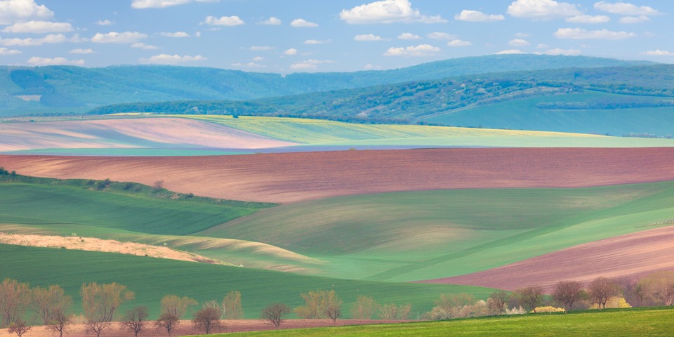 Spring Landscape of Fields in Countryside of Hills Stretched and Framed