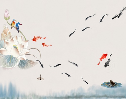 Adhesive Poster Lotus Flower with Colorful Koi Fish and Kingfishers in Tranquil Pond Illustrations Realism Rustic Nature RelaxCalm Multicolor Living Room Bedroom Office