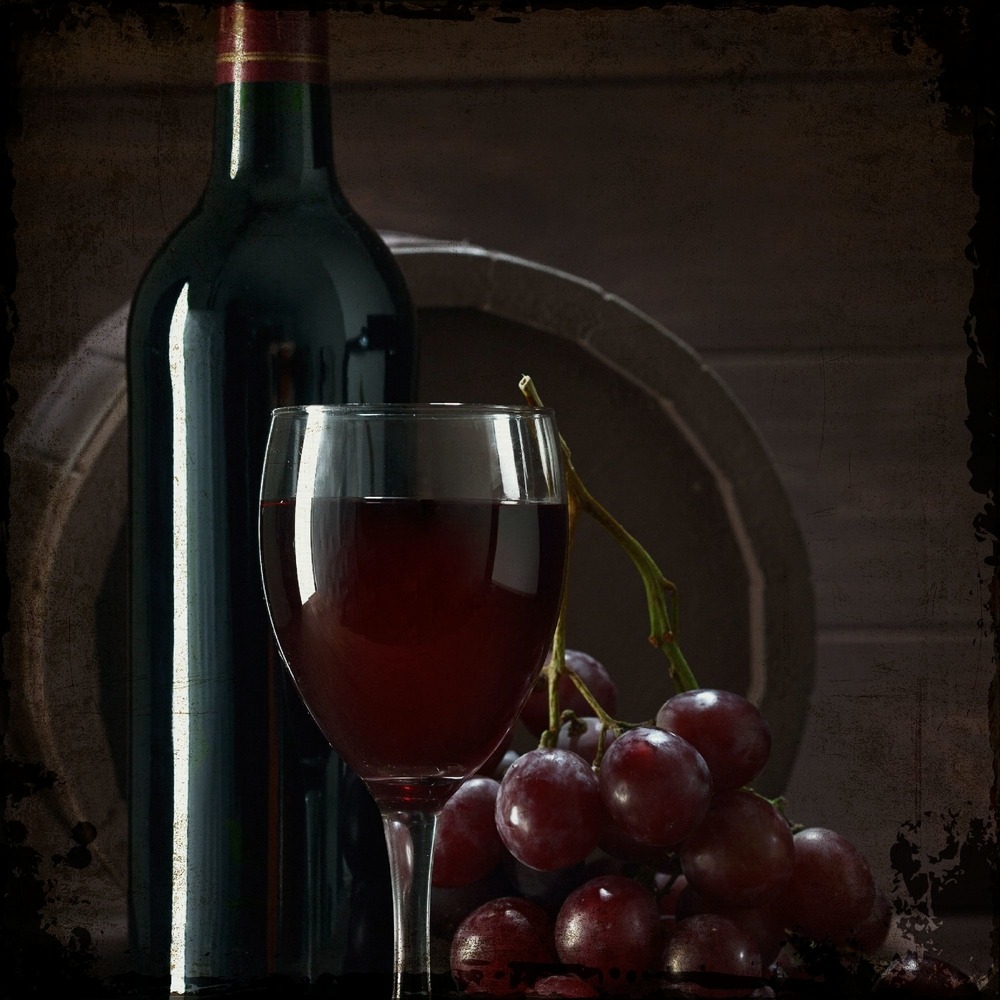 Square Rustic Glass of Wine with Wine Bottle and Grapes