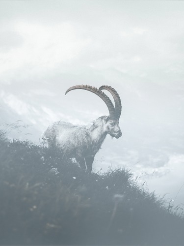 SIGNLEADER Framed Long Horned Ram on Mountain Cliff Animals Wilderness Photography Realism Portrait RelaxCalm Blue Duotone Living Room Bedroom Office WHITE