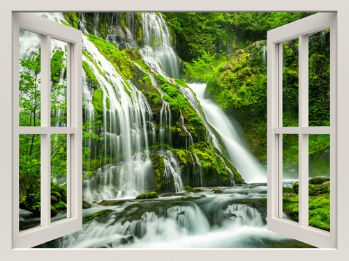 IDEAWALL Removable Sticker Mural Vibrant Green Mountain Waterfall Rapids Nature Wilderness Photography Rustic Landscape Colorful Living Room Bedroom Office