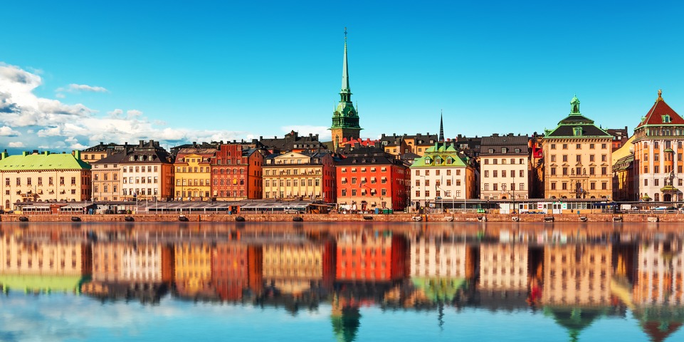 Scenic Summer Panorama of The Old Town (Gamla Stan) Pier Architecture in Stockholm Sweden Stretched and Framed