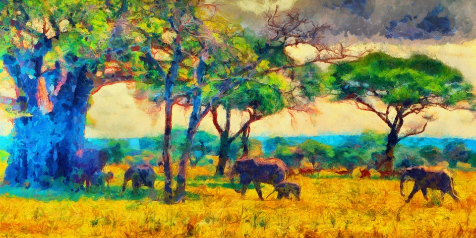 Colorful Impressionist African Landscape with Elephants Oil Painting Stretched and Framed