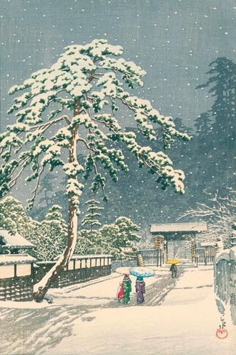 Framed Japanese Ukiyoe Painting Scenery of a Temple in Snow Weather by Hasui Kawase