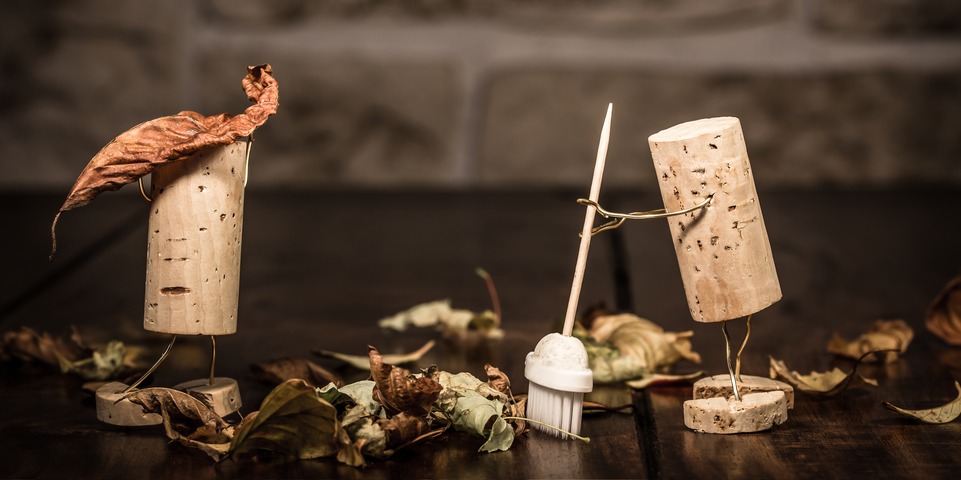 Concept Men Clean Up Leaves Wine Cork Figures Stretched and Framed