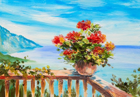Oil Painting Landscape Bouquet of Flowers in The Background of Mediterranean Sea Removable Mural SelfAdhesive Large paper