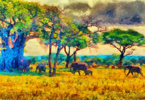 Colorful Impressionist African Landscape with Elephants Oil Painting Removable Mural SelfAdhesive Large paper