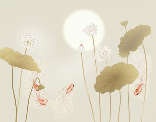 Framed Poster Lotus Blossoms and Goldfish Under Full Moon in Serene Scene Illustrations Realism Rustic Nature RelaxCalm Multicolor Living Room Bedroom Office Black