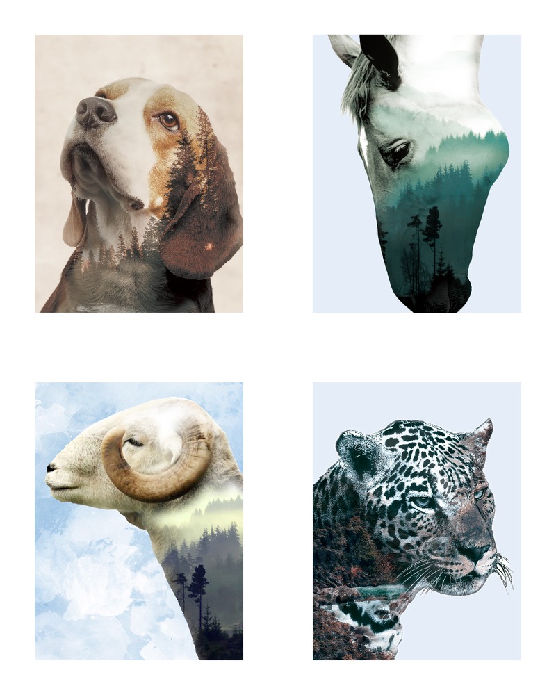 Woodrose Framed Collage Set Double Exposure Horse Dog Cheetah Ram Animals Wildlife Digital Realism Nature Rustic Portrait Living Room Bedroom Office Black