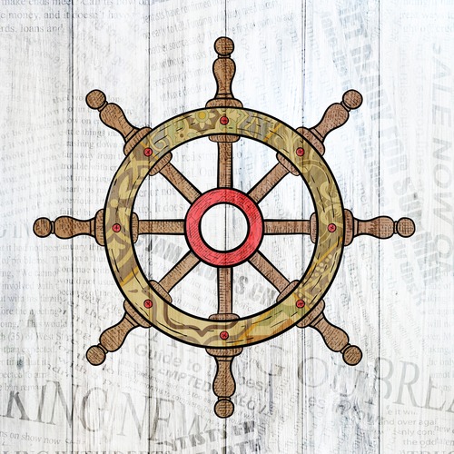 Square Rustic Sailing Themed Wooden Ship Captain Steering Wheel on Wood Background