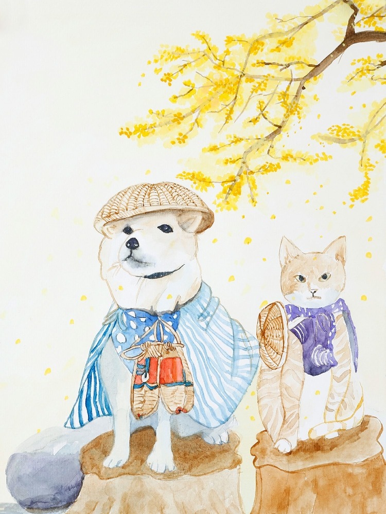 Hanging Poster with Wood Frames Japanese Painting of Dog and Cat Travelling in Spring Decorative