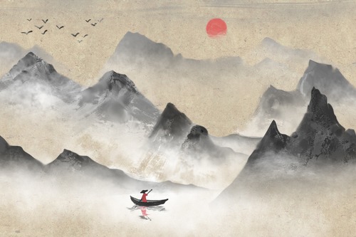 Framed Chinese Watercolor Fisherman and Mountains Nature Wilderness Illustrations Rustic Scenic Colorful Living Room Bedroom Office Black