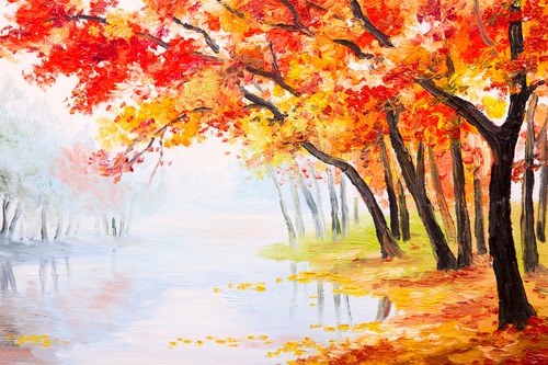 Framed Watercolor Effect Red Orange Autumn est Nature Wilderness Illustrations Rustic Scenic Multicolor Living Room Bedroom Office Black